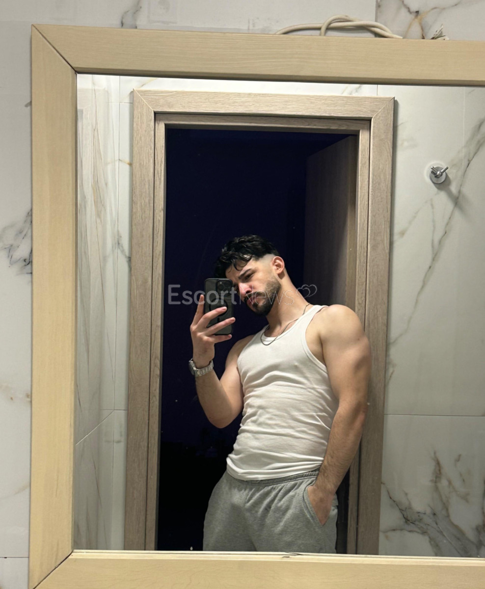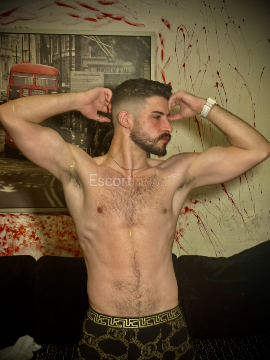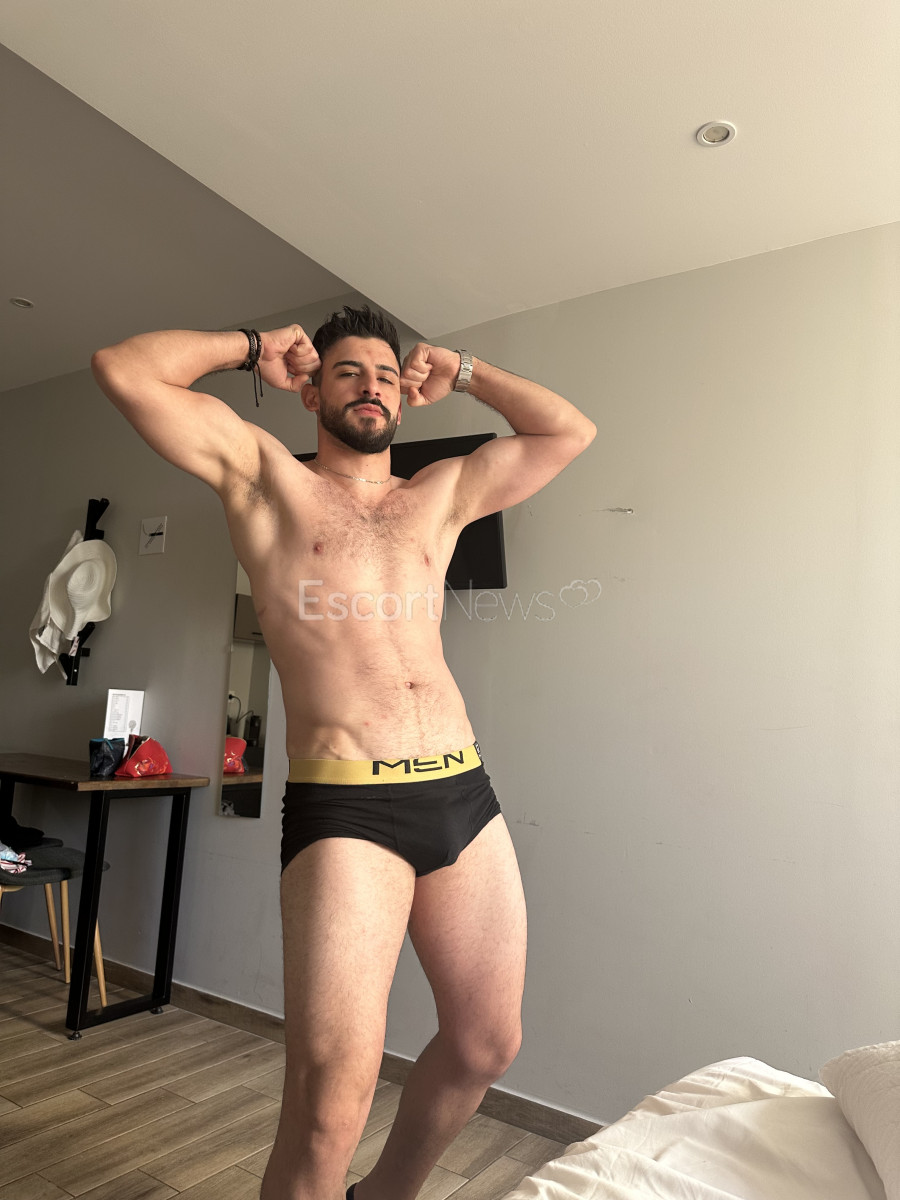 Arabian beauty. Fitness guy with a sculpted body, a little hair.